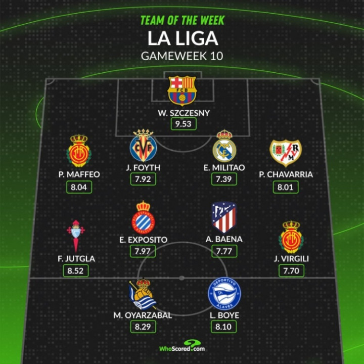 WhoScored西甲第10轮最佳阵容如下: