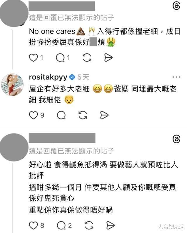 其中一位毫不留情地讽刺道:“拜托你了,食得咸鱼抵得渴,要做艺人,就应该做好被人批评的心理准备。每个月赚这么多钱,还要其他人顾及你的感受,真的太贪心了。重点是,你真的演得不好!”