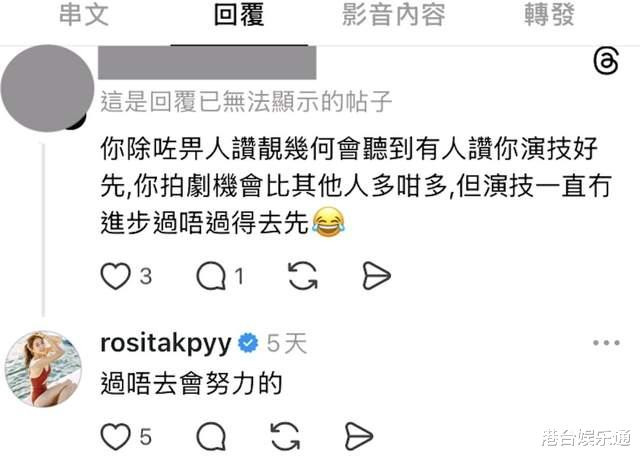 在Threads上,一位香港网友疑似因为无法忍受郭柏妍的演技,直接跑到郭柏妍的账号帖文下展开抨击:“你除了被人称赞漂亮外,有听过谁说你演技好吗?你拍戏的机会比其他人多这么多,但演技一直没进步!到底还过不过得去?”