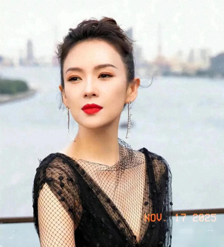章子怡穿着白色羽绒服,戴着紫色的帽子,散着头发,皮肤白皙,气质出众!不愧是国际章!
