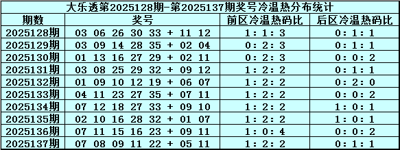 体彩大乐透第25137期奖号为:07 08 09 11 22+05 11,前区奖号奇偶比为3:2,012路比为1:2:2,大小比为1:4,遗漏总值为25,后区号码遗漏总值为9。