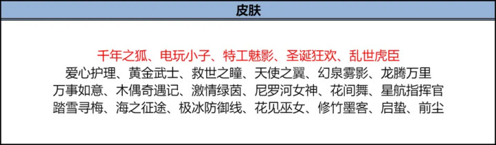 本期皮肤碎片上架了电玩小子、特工魅影、千年之狐、乱世虎臣、圣诞狂欢这五款史诗皮肤,可用皮肤碎片免费兑换,皮肤碎片能在战令币商店免费获得。其次,还有激情绿茵、龙腾万里、花间舞等精品皮肤可供兑换。