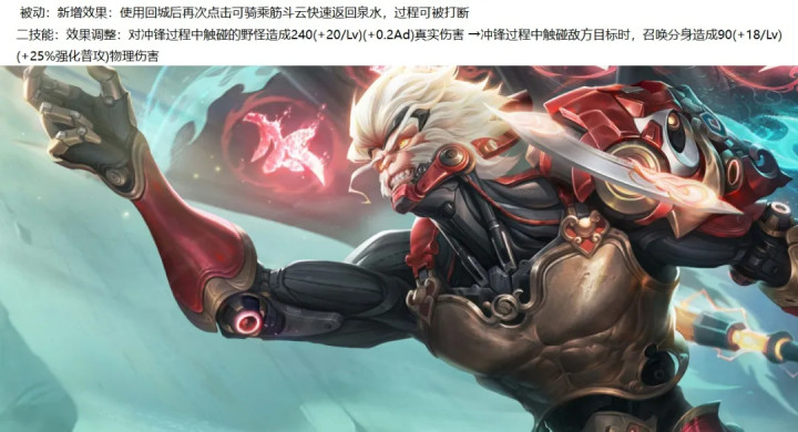 孙悟空加强:连点两次回城可以乘坐筋斗云飞回泉水(打断机制跟回城一样),2技能新增分身攻击,起跳依旧可以斩杀残血野怪。
