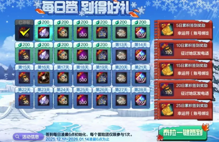 只要在12.17~1.14活动期间内上线,就可以领取10个矛盾、3张幸运符、100张深渊票、1000万金币等。