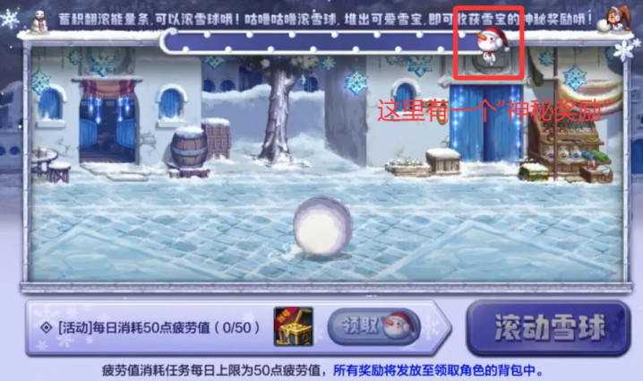 每天消耗50疲劳值可领取1万金币,然后滚动雪球堆雪人,可获得神秘小礼物!