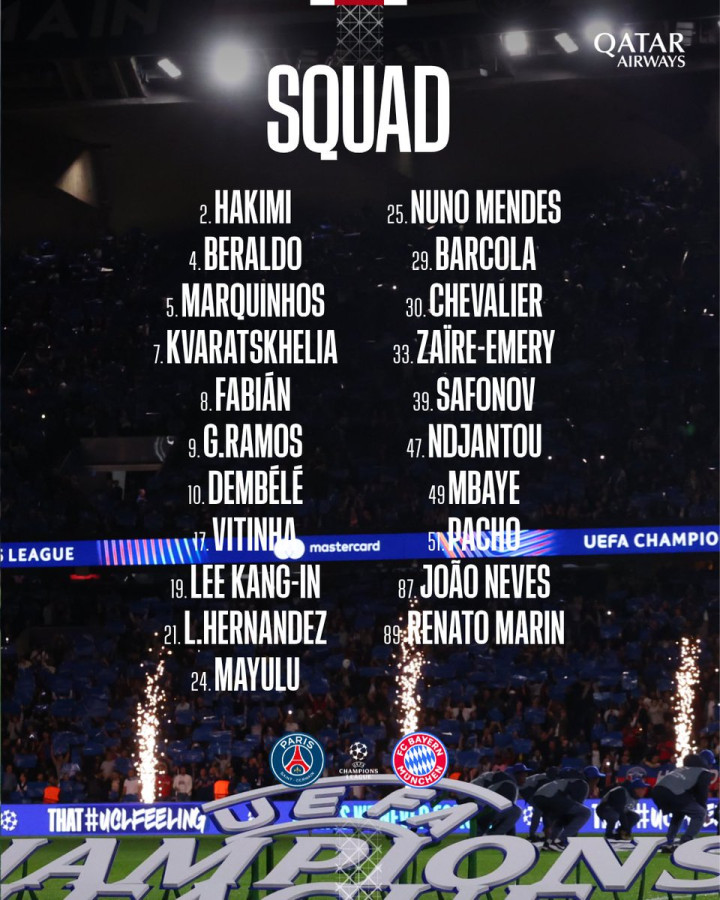巴黎对阵拜仁大名单: 登贝莱领衔, 阿什拉夫在列, 杜埃缺席