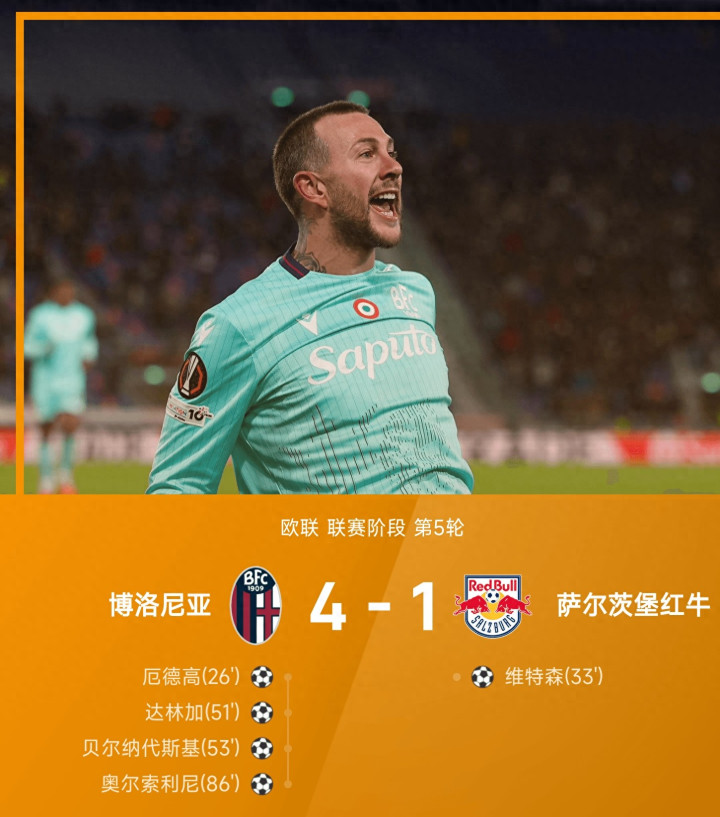 11月28日 25/26赛季欧联联赛阶段第5轮,博洛尼亚4-1战胜萨尔茨堡红牛。上半场比赛,厄德高以及维特森先后破门,两队战成1-1平。易边再战,达林加以及贝尔纳代斯基3分钟内连入两球,帮助博洛尼亚奠定胜局。终场前,奥尔索利尼再下一城,最终将比分定格在了4-1。