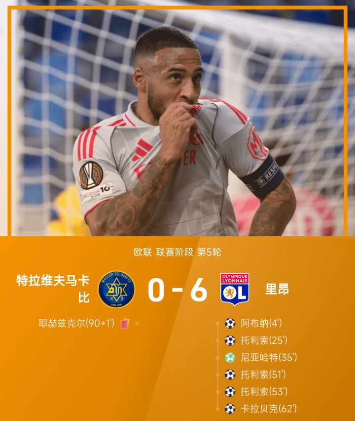 25/26赛季欧联联赛阶段第5轮,里昂6-0战胜特拉维夫马卡比。全场比赛,托利索如有神助贡献帽子戏法,尼亚哈特、阿布纳、卡拉贝克破门建功,全场比赛下来里昂在进攻方面火力全开,上半场取得3-0联系我,下半场再次打进3球,里昂6-0击败特拉维夫马卡比,随着本场取得大胜里昂在欧联积分方面以12分登顶欧联领头羊。