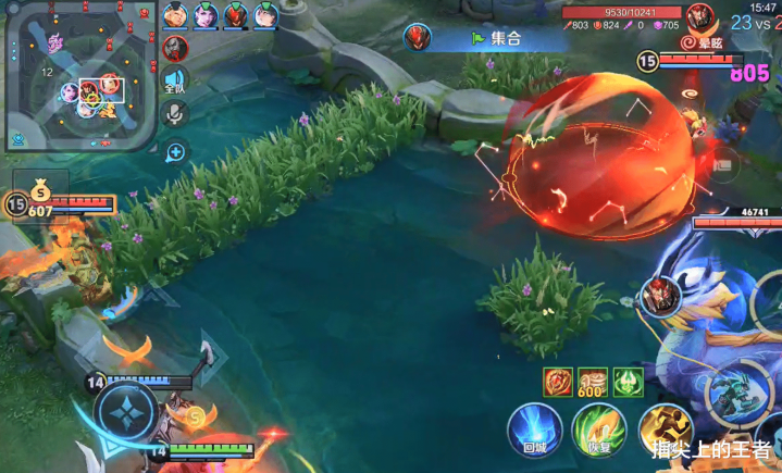 后期墨子手长的优势就展现出来了,通过二技能不断排草来探清敌方的具体位置,虽然现在不会出回响之杖,但草里有人一般都会有系统提示,有时候也可以根据二技能的命中距离来判定。